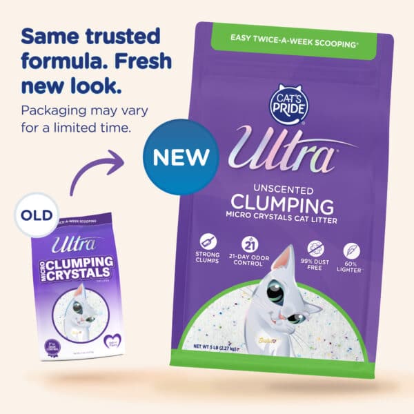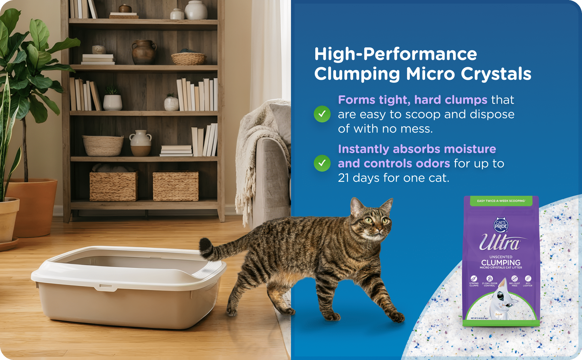 Ultra by Cat’s Pride Unscented Clumping Micro Crystals delivers powerful, long-lasting odor control in a lightweight, easy-to-use formula. It forms strong, tight clumps that lock in odors and make scooping quick and mess-free. Instant and long-lasting clumping helps to maintain a cleaner, fresher litter box for up to 21 days. The micro crystals are fragrance-free, 99% dust-free and soft on paws, offering a gentle experience even for sensitive cats. Plus, it’s 60% lighter than traditional litter, making it easier to pour, store, and handle.