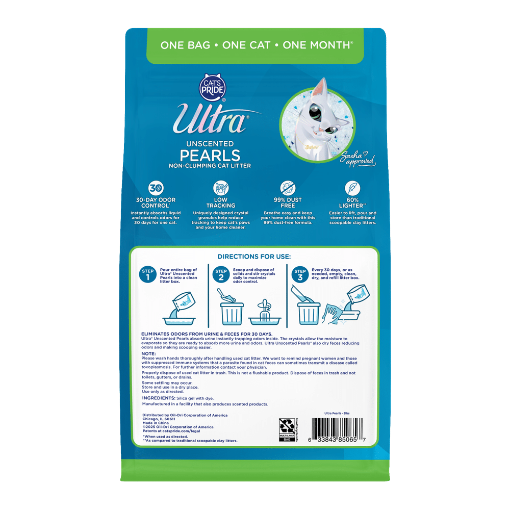 Ultra by Cat’s Pride Pearls is a lightweight, low dust, low tracking crystal cat litter that absorbs moisture and traps odor to keep the litter box fresh for 30 days. Low maintenance and easy to use – just scoop the poop and one bag lasts for one month.