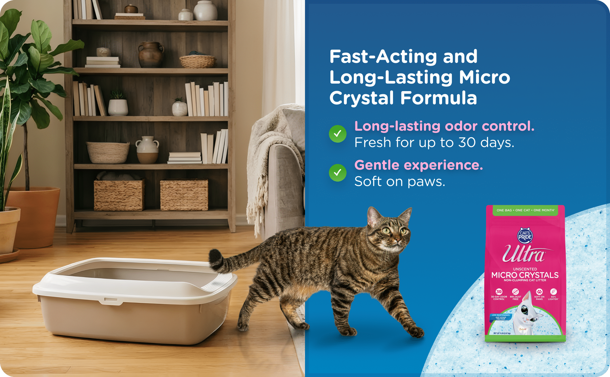 Ultra by Cat’s Pride Unscented Micro Crystals Non-Clumping Cat Litter Unscented delivers powerful 30-day odor control in a low-maintenance formula that’s 99% dust-free, soft on paws litter, reducing tracking while being gentle and comfortable on your cat. soft on paws and helps keep your home cleaner without any added fragrances. Plus, it’s 60% lighter than traditional scoopable litters, making it easier to carry, pour, and store. Just scoop the poop — one bag lasts an entire month for one cat.