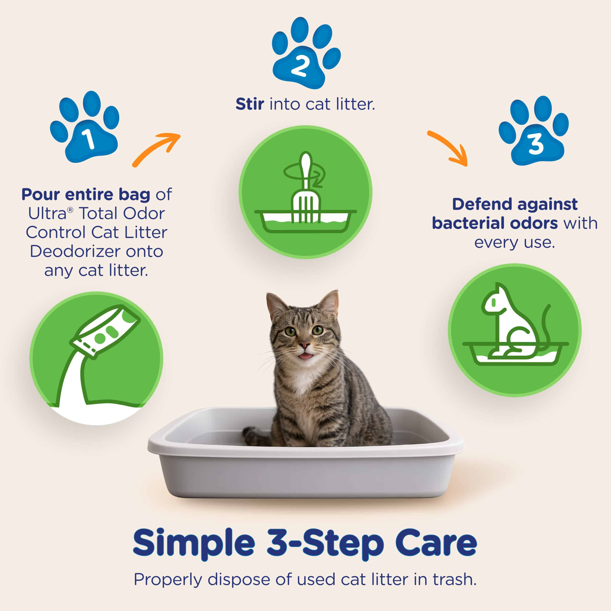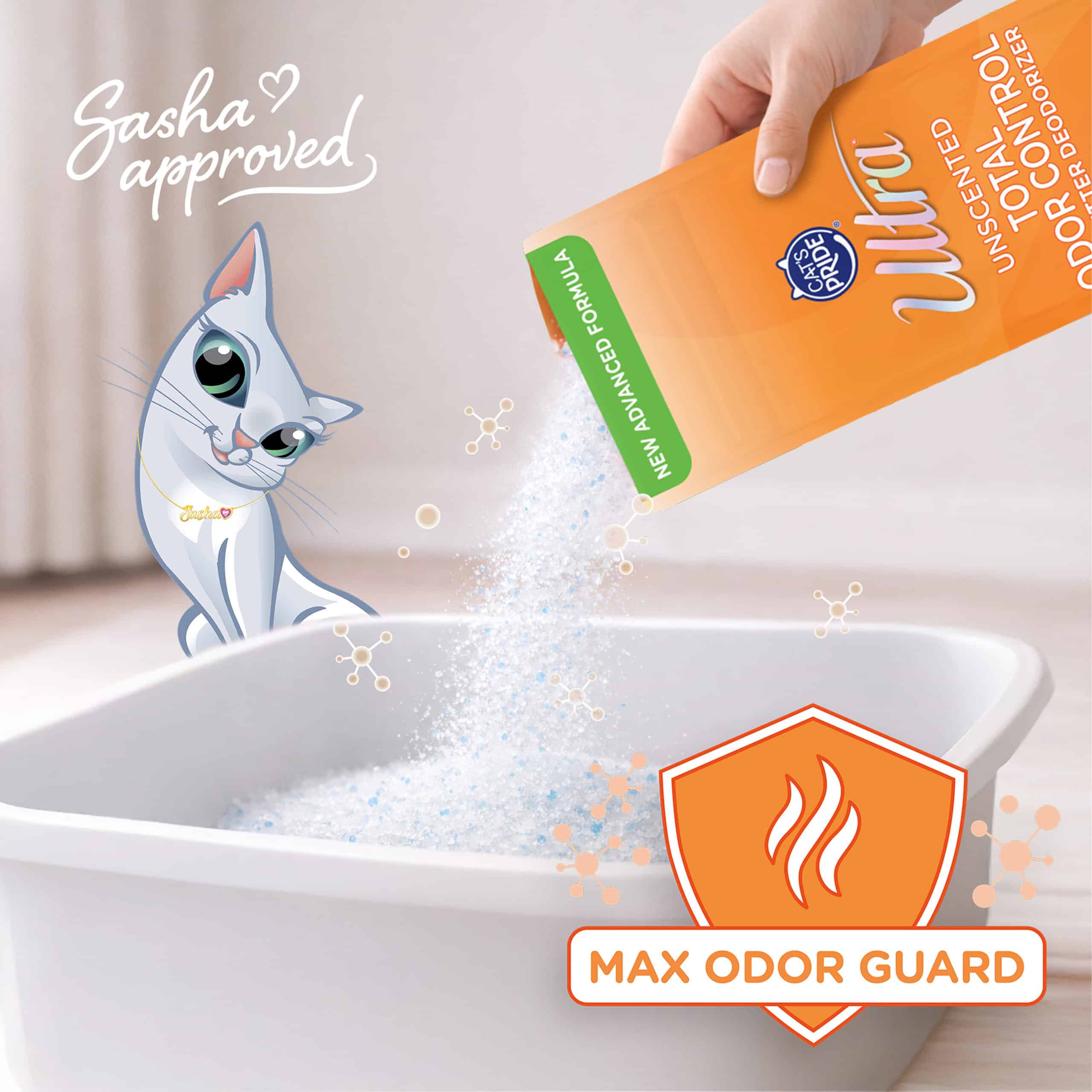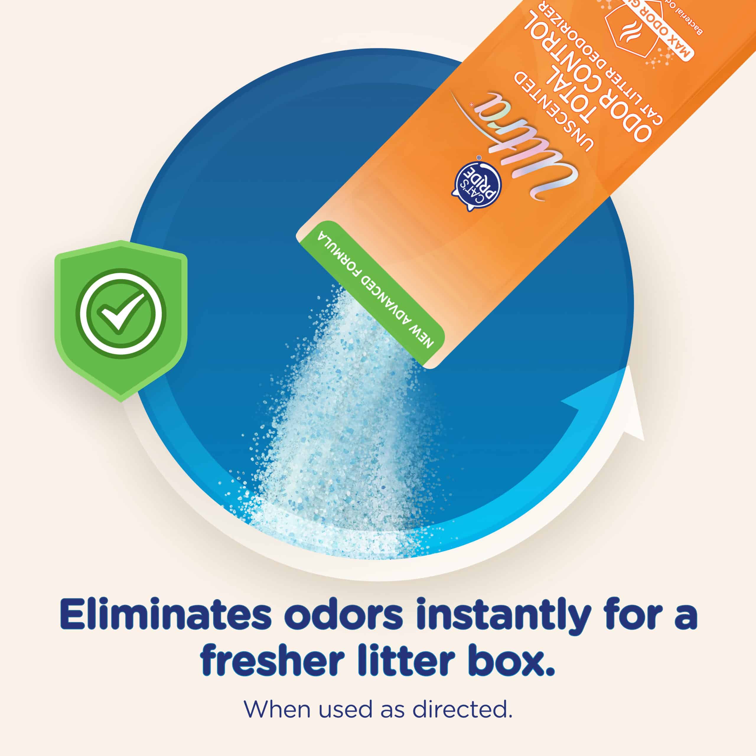 Ultra by Cat’s Pride Total Odor Control Unscented Cat litter Deodorizer with proprietary Max Odor Guard technology traps moisture and helps provide bacterial odor protection. Can be used and added to any cat litter.