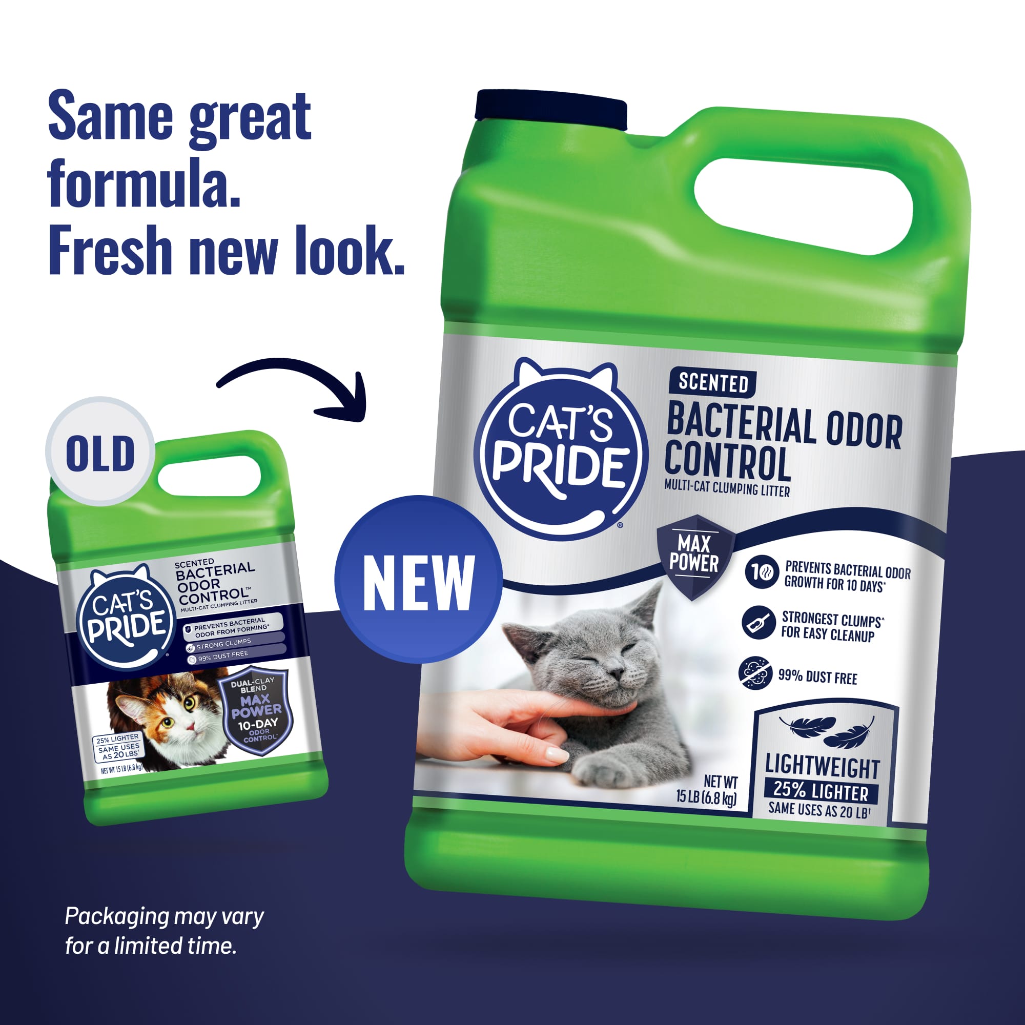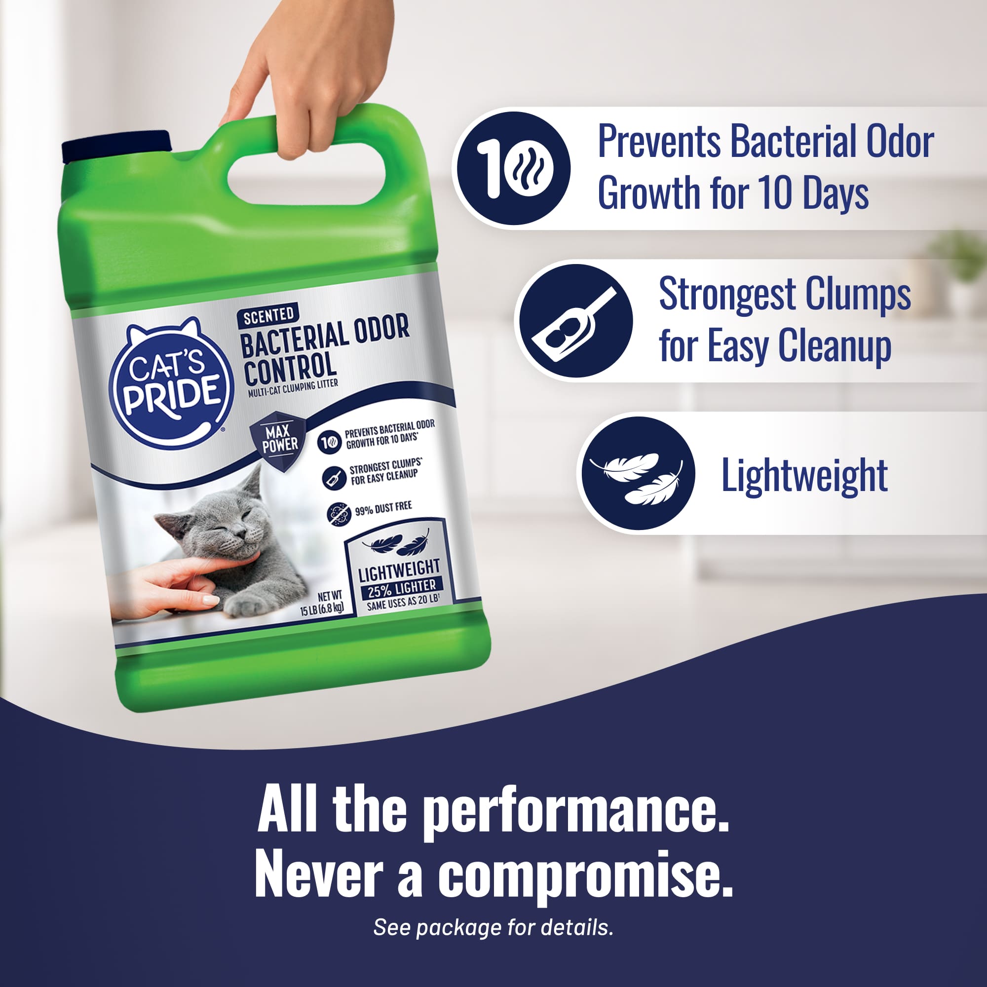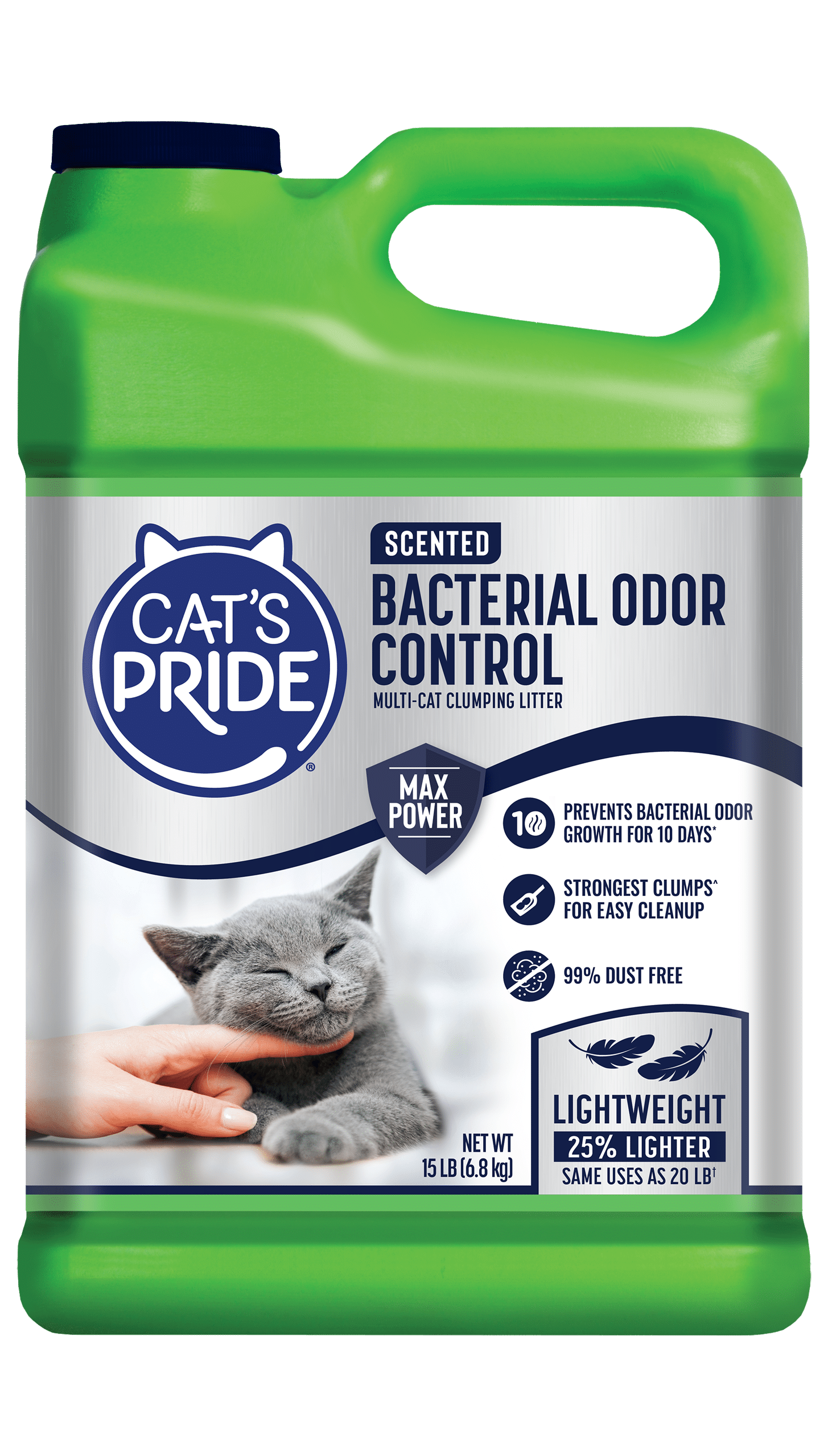 Cat’s Pride Bacterial Odor Control clumping litter is formulated with our patented Max Power dual-clay blend that prevents the growth of bacterial odor for 10 days. It forms the strongest clumps and is 99% dust free, making litter easy to scoop and dispose. Plus, it’s 25% lighter than traditional clumping litters, so it’s easier to pour and store.