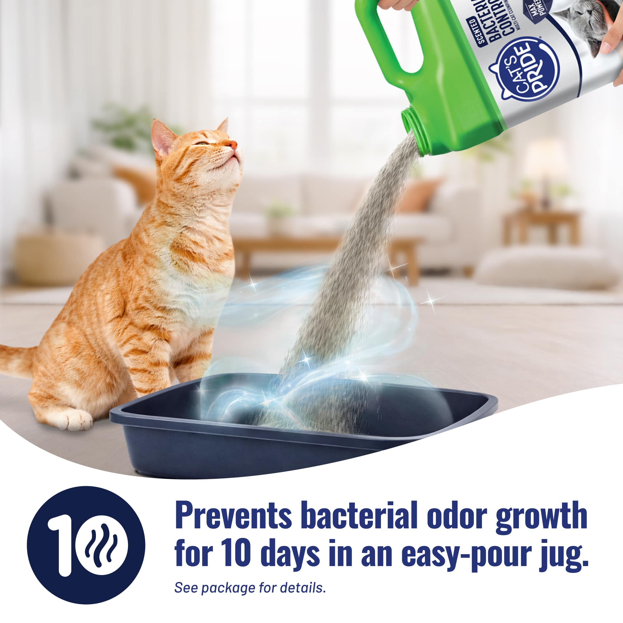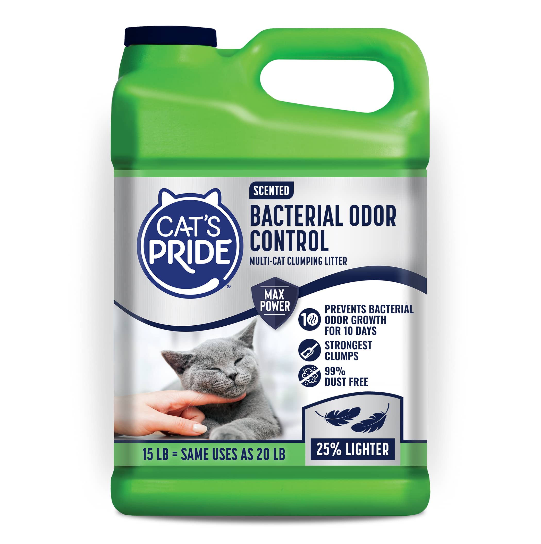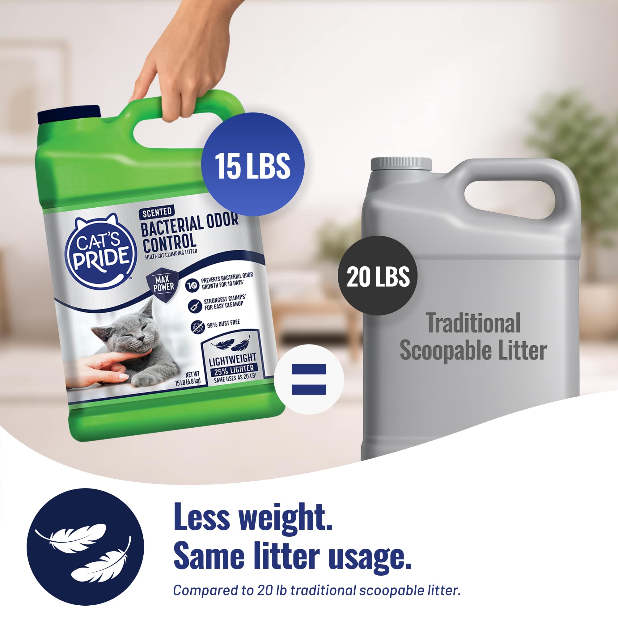 Cat’s Pride Bacterial Odor Control clumping litter is formulated with our patented Max Power dual-clay blend that prevents the growth of bacterial odor for 10 days. It forms the strongest clumps and is 99% dust free, making litter easy to scoop and dispose. Plus, it’s 25% lighter than traditional clumping litters, so it’s easier to pour and store.