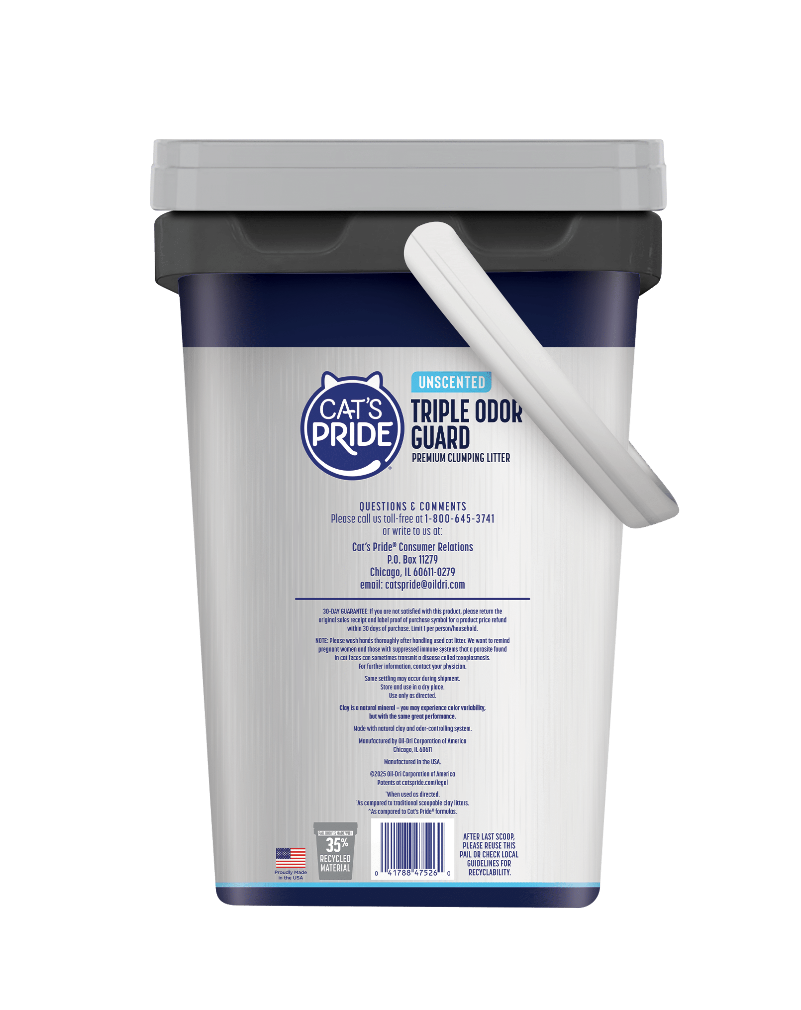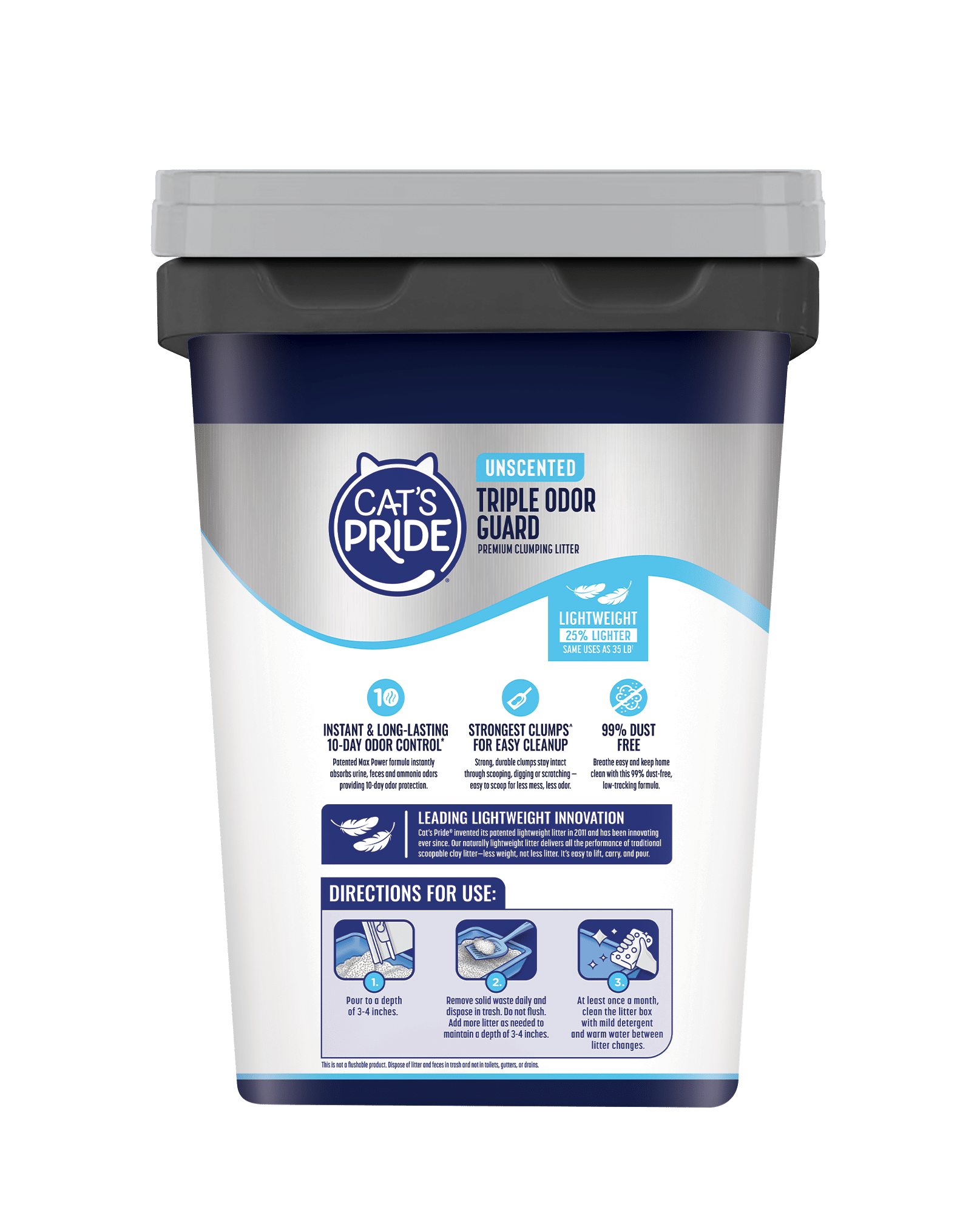 Cat’s Pride Triple Odor Guard Unscented Hypoallergenic Clumping litter is guaranteed to instantly trap and eliminate urine, feces and ammonia odors for 7 days through its patented Max Power dual-clay formula. Breathe easy and keep floors clean with this 99% dust-free, low-tracking formula that also forms the strongest clumps so they’re easy to scoop and dispose, leaving no mess or odor behind.