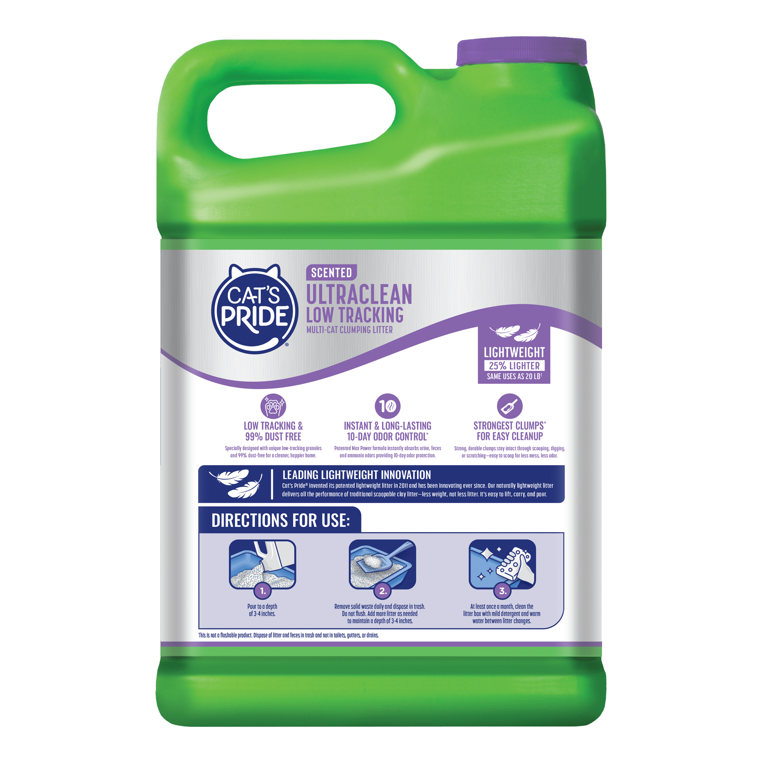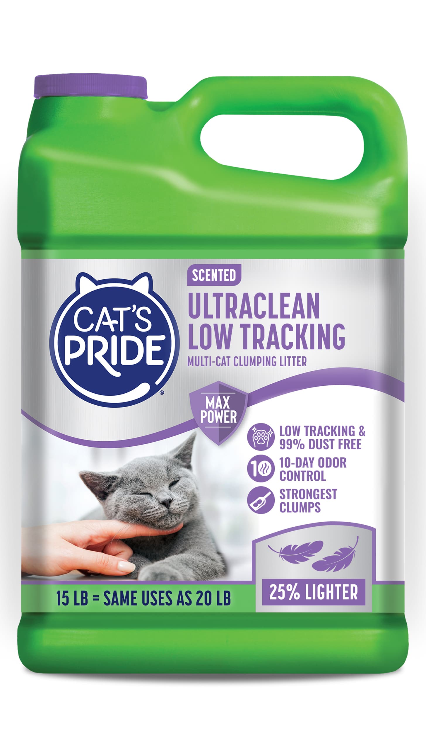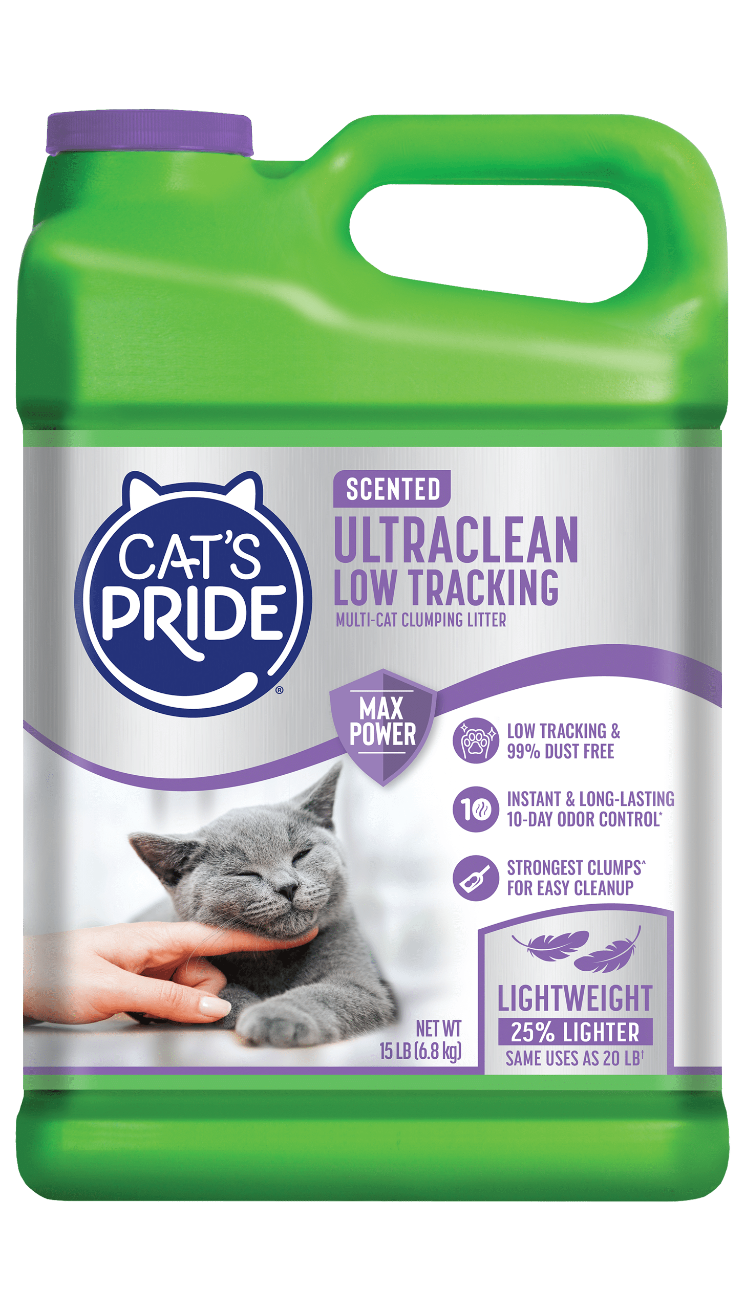 Cat’s Pride UltraClean Scented Low Tracking Litter is specially designed with unique low-tracking granules to help keep your kitty’s paws litter-free and your home nice and clean! Cat’s Pride’s Max Power dual-clay formula works immediately to trap and get rid of odor for 10 days. And since it’s 99% dust free, you and your kitty can breathe easy! This litter forms strong clumps for easy, no-mess cleanup. Plus it’s 25% lighter than traditional scoopable litter making it easy to carry and pour.