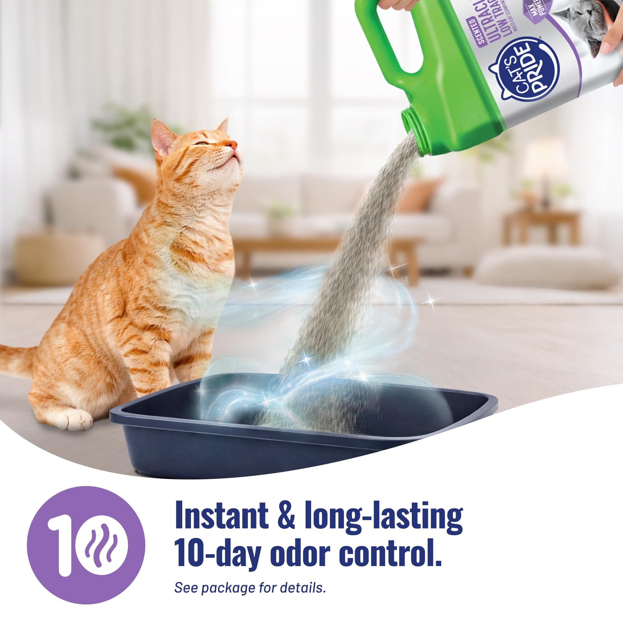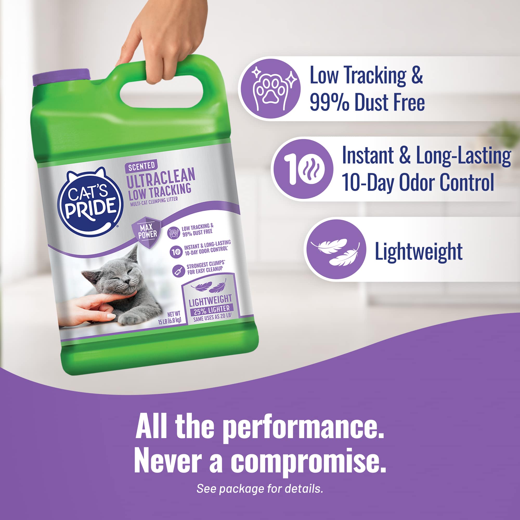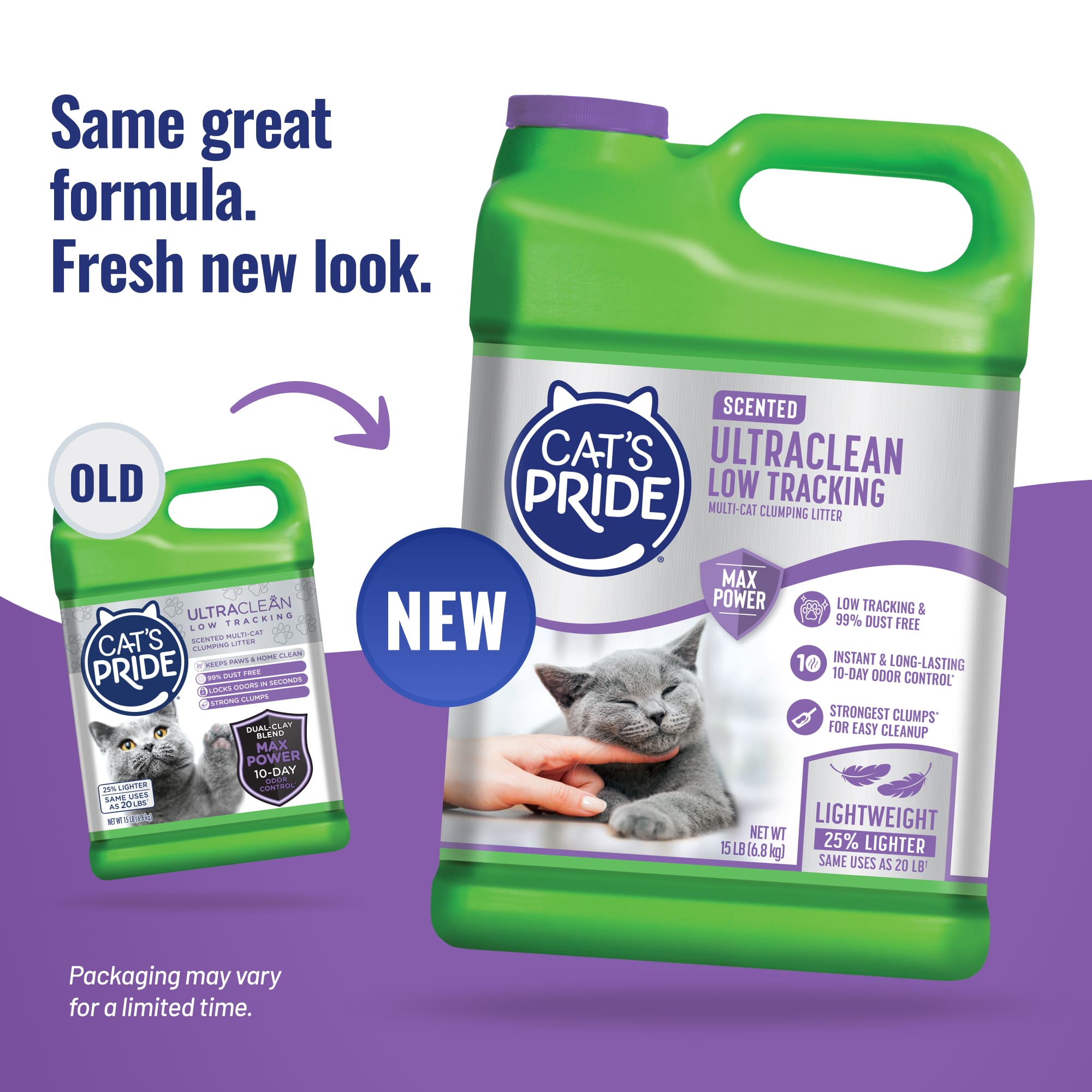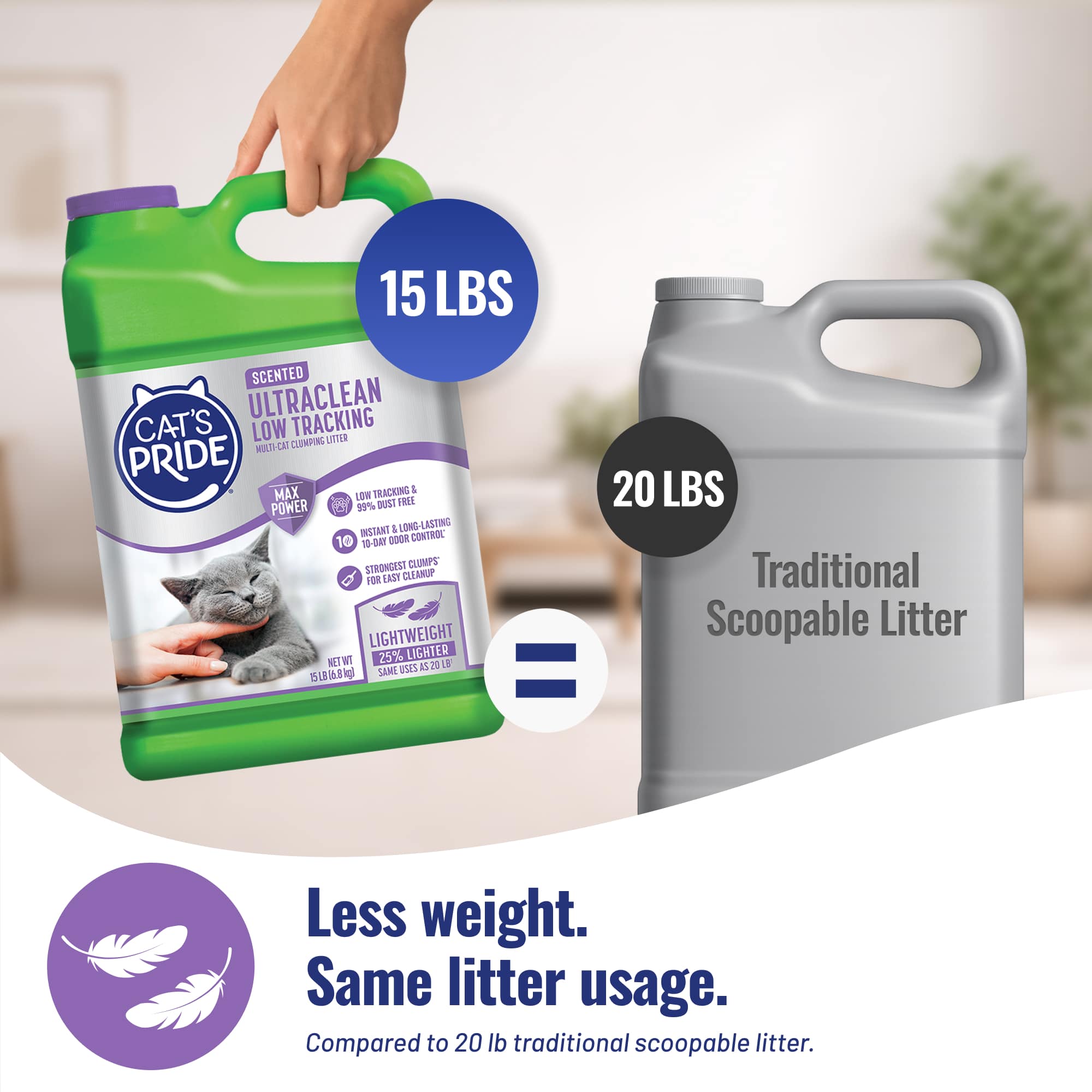 Cat’s Pride UltraClean Scented Low Tracking Litter is specially designed with unique low-tracking granules to help keep your kitty’s paws litter-free and your home nice and clean! Cat’s Pride’s Max Power dual-clay formula works immediately to trap and get rid of odor for 10 days. And since it’s 99% dust free, you and your kitty can breathe easy! This litter forms strong clumps for easy, no-mess cleanup. Plus it’s 25% lighter than traditional scoopable litter making it easy to carry and pour.